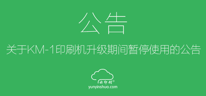? ? ? 您好!云印刷生產(chǎn)中心的柯尼卡美能達(dá)KM-1噴墨印刷機(jī)將于5月18日-6月3日期間進(jìn)行軟件系統(tǒng)和硬件設(shè)備升級(jí),升級(jí)期間將暫停使用,屆時(shí)所下的訂單將安排至其他印刷機(jī)進(jìn)行生產(chǎn),如給您造成不便敬請(qǐng)諒解!